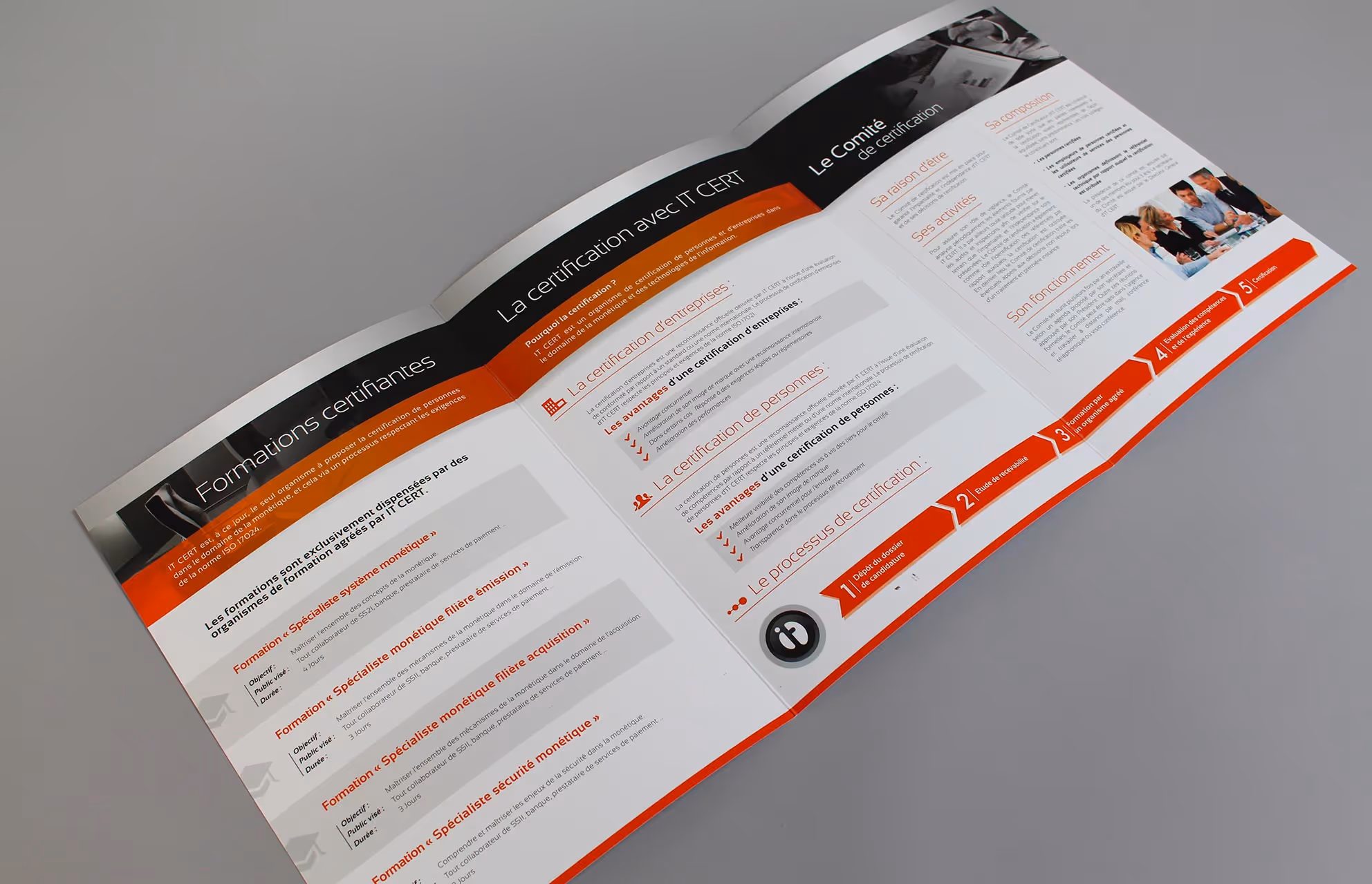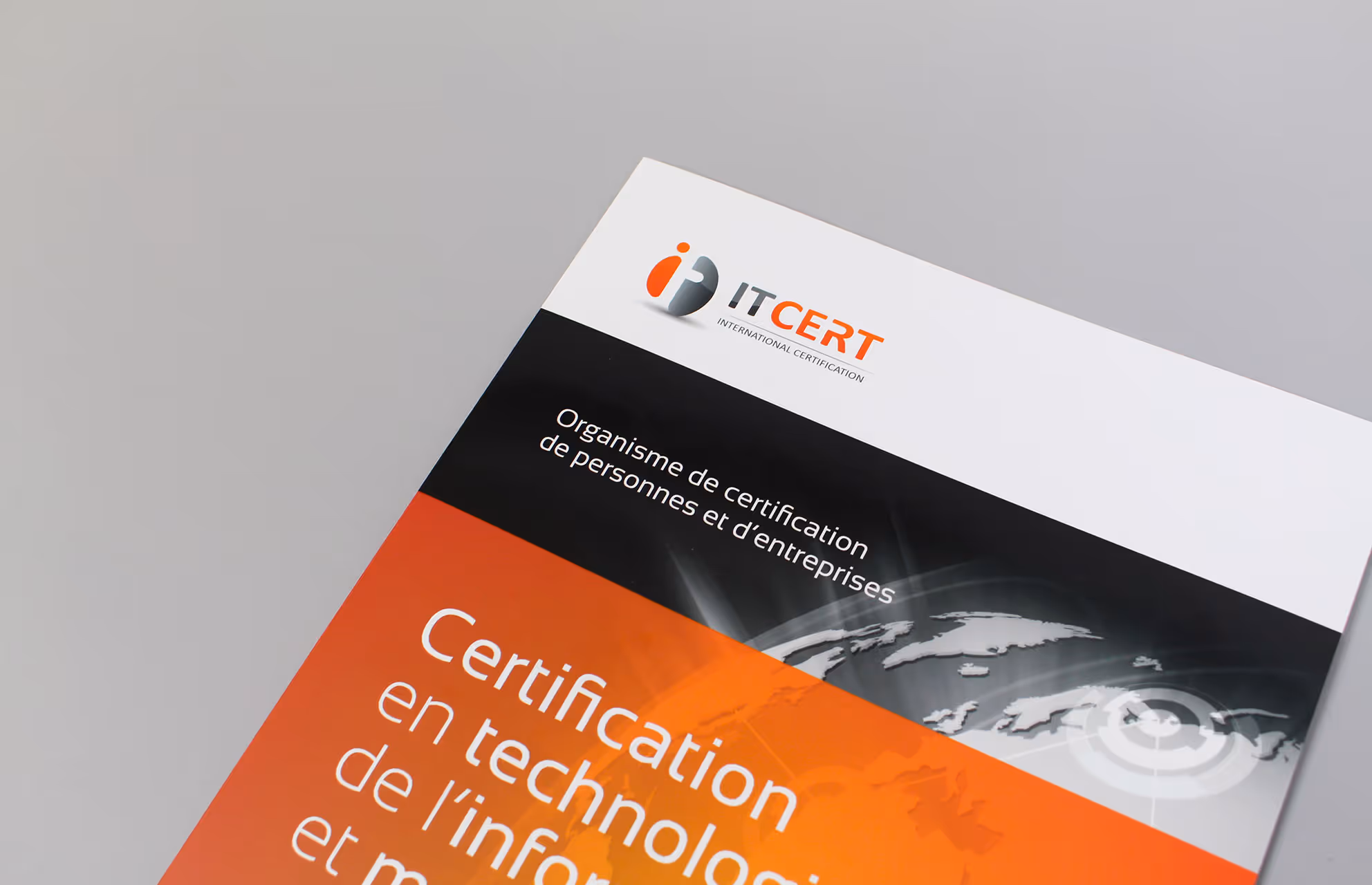 IT Cert est un organisme de certification de personnes et d’entreprises en technologies de l’information et monétique qui collabore avec des centres de formation agréés en France et dans d’autres pays d’Europe. IT Cert est à ce jour le seul organisme à proposer la certification de personnes dans le domaine de la monétique via un processus respectant les exigences de la nome ISO 27024. Conception d’une brochure en 3 volets recto verso et impression en quadrichromie offset avec pelliculage mat et vernis sélectif.
