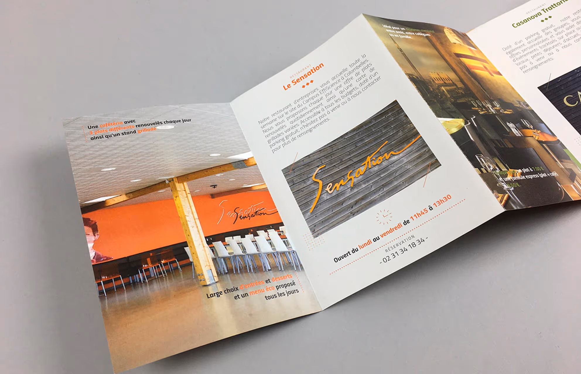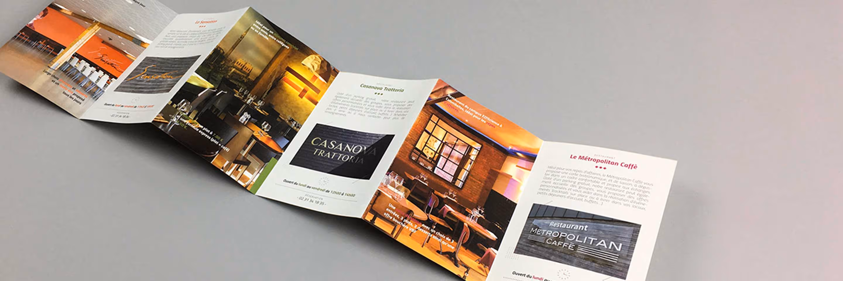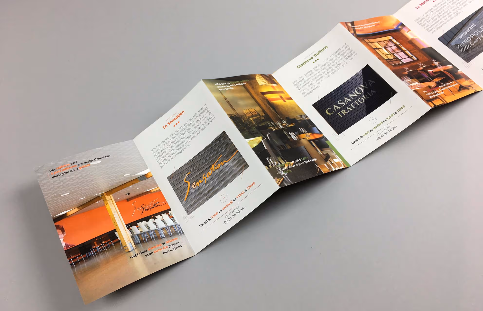 Le Pôle de Restauration du Campus Efficience à Colombelles en Normandie est composé de plusieurs restaurants avec des thématiques différentes : restaurant d’entreprises, trattoria italienne, boulangerie, un café-brasserie, le tout géré par le Groupe Elior. La demande était de présenter sur un même document imprimé ces différents lieux aux ambiances marquées avec l’utilisation d’un format accordéon pour pouvoir ranger facilement ce support de présentation et le garder à portée de main. Réalisation d’un shooting photo et impression sur un papier recyclé.