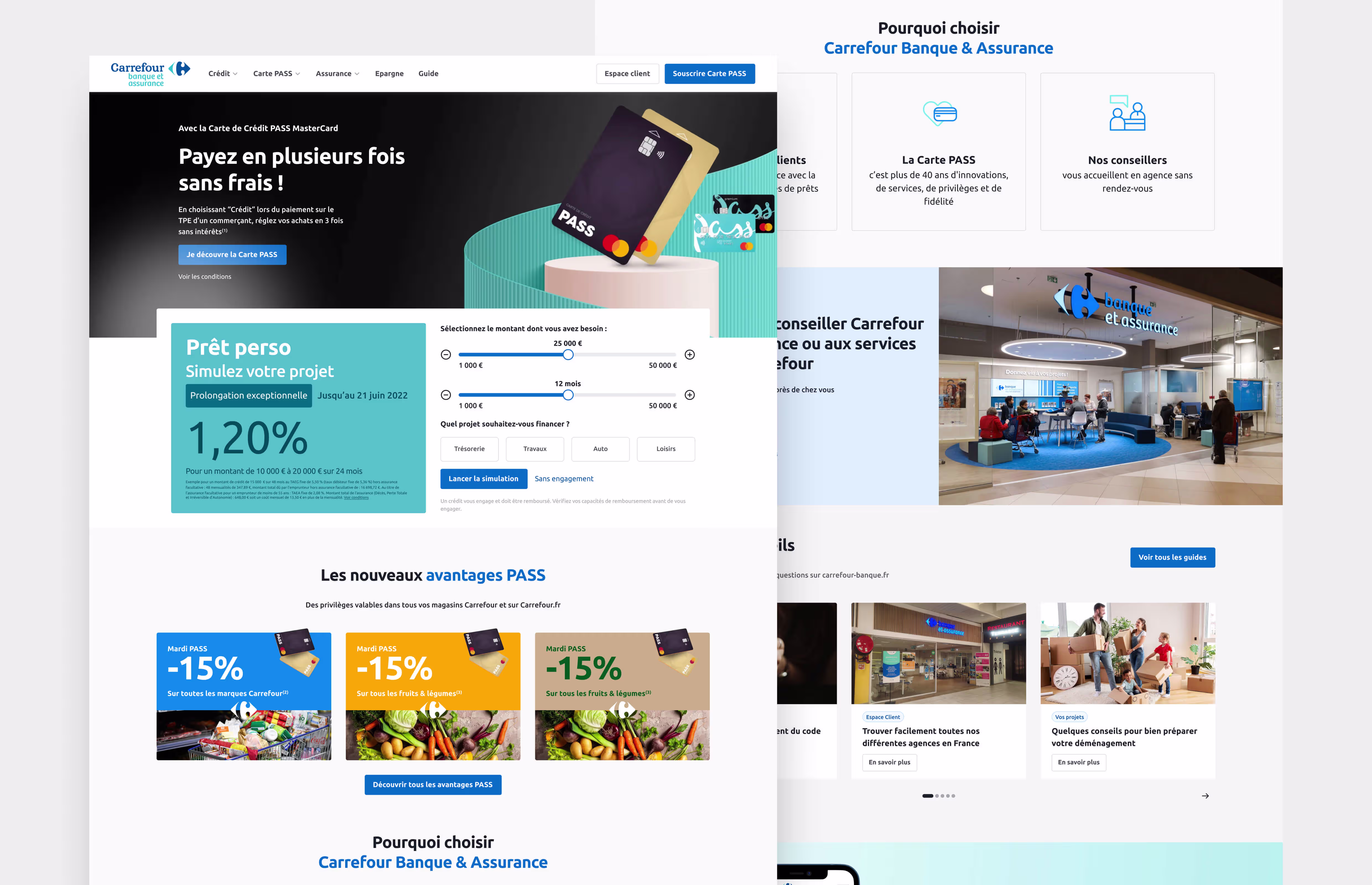 Durant toute l'année 2022, j’ai accompagné la Digital Factory de Carrefour Banque en tant que UI Designer freelance sur l’espace client web et l’application mobile. J’ai conçu des interfaces pour de nouvelles fonctionnalités liées à l’espace client et des parcours de souscription pour un produit d’assurance vie et un compte sur livret. Mon rôle incluait la prise des besoins avec les équipes métiers, la création de parcours et maquettes haute fidélité, la passation avec les équipes de développement ainsi que du recettage.