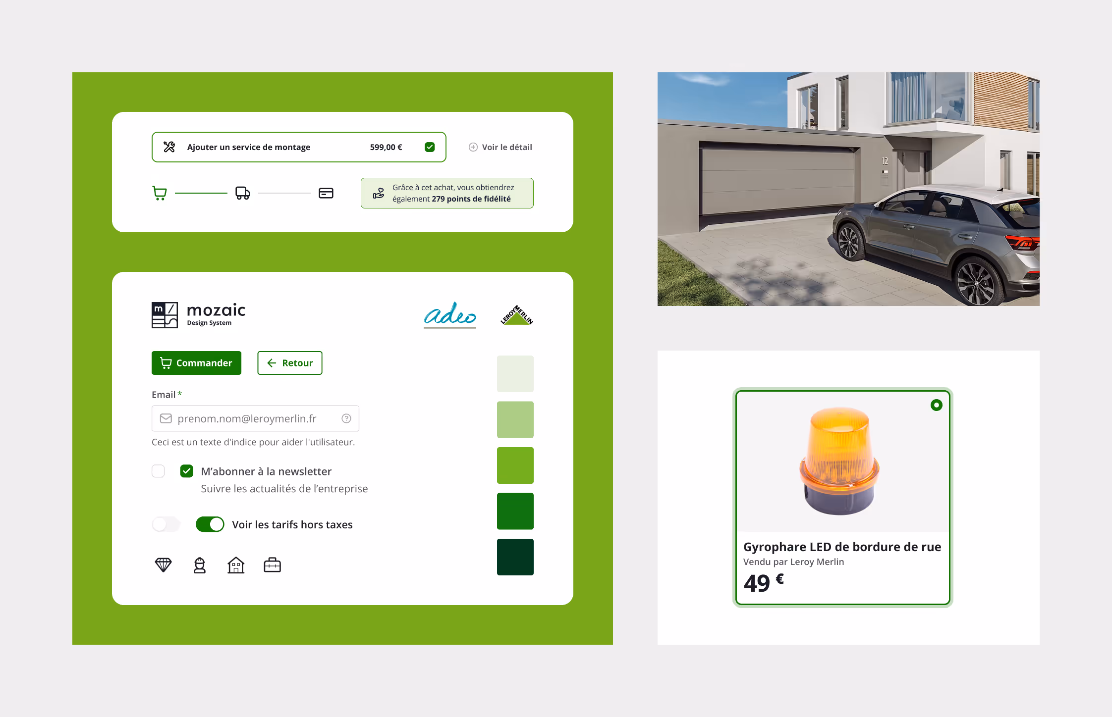 En tant que UI Designer au sein de l’équipe des configurateurs d'ADEO / Leroy Merlin France de 2023 à 2025, j’ai conçu des interfaces et des parcours clients / collaborateurs en formats web & mobile pour différents produits.
