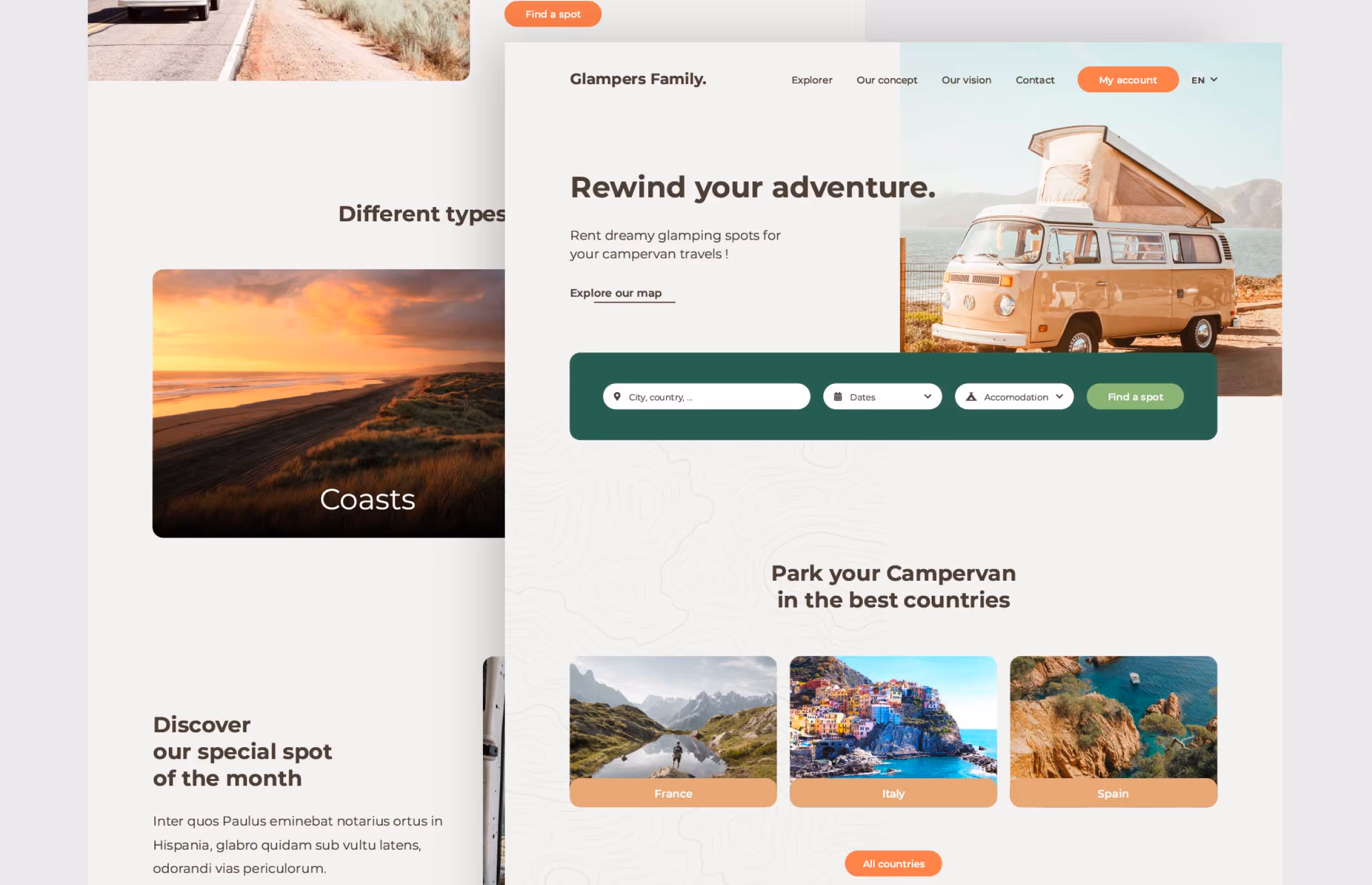 Glampers Family a fait appel à mes services pour la conception UX/UI d’une marketplace mettant en relation des propriétaires terriens et des campeurs à la recherche de stationnement pour van aménagés et autres type de véhicule, un AirBnb des campeurs. Alternative aux campings traditionnels et au camping sauvage, les campeurs peuvent effectuer des recherches par pays, région ou ville et trouver ainsi des terrains disponibles pour stationner sur une période donnée. Glampers Family souhaite s’implanter partout en Europe aussi bien sur les côtes qu’à la montage ou à la campagne.