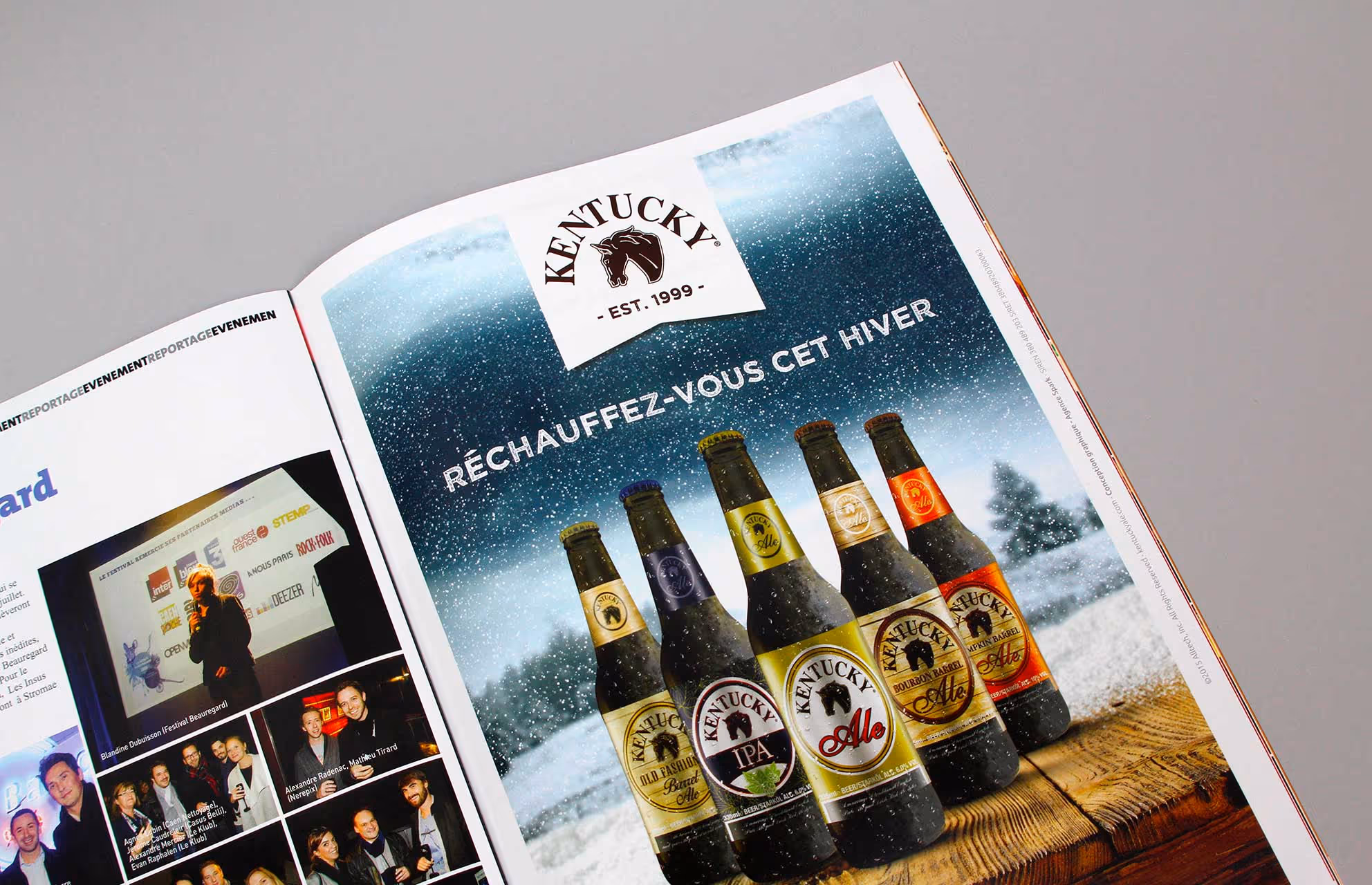 Conception d’un visuel publicitaire A4 avec comme thématique l’hiver pour la division France de la marque de bière Américaine Kentucky Ale de la Lexington Brewing & Distilling Company, basée à Lexington dans le Kentucky et fondée en 1999 par Pearse Lyons. Important travail de photo-montage pour reconstituer une ambiance froide et hivernale, avec comme consigne principale le fait de retrouver un aspect givré sur les produits de la marque. Diffusion dans le Stemp Magazine de Caen numéro 36.