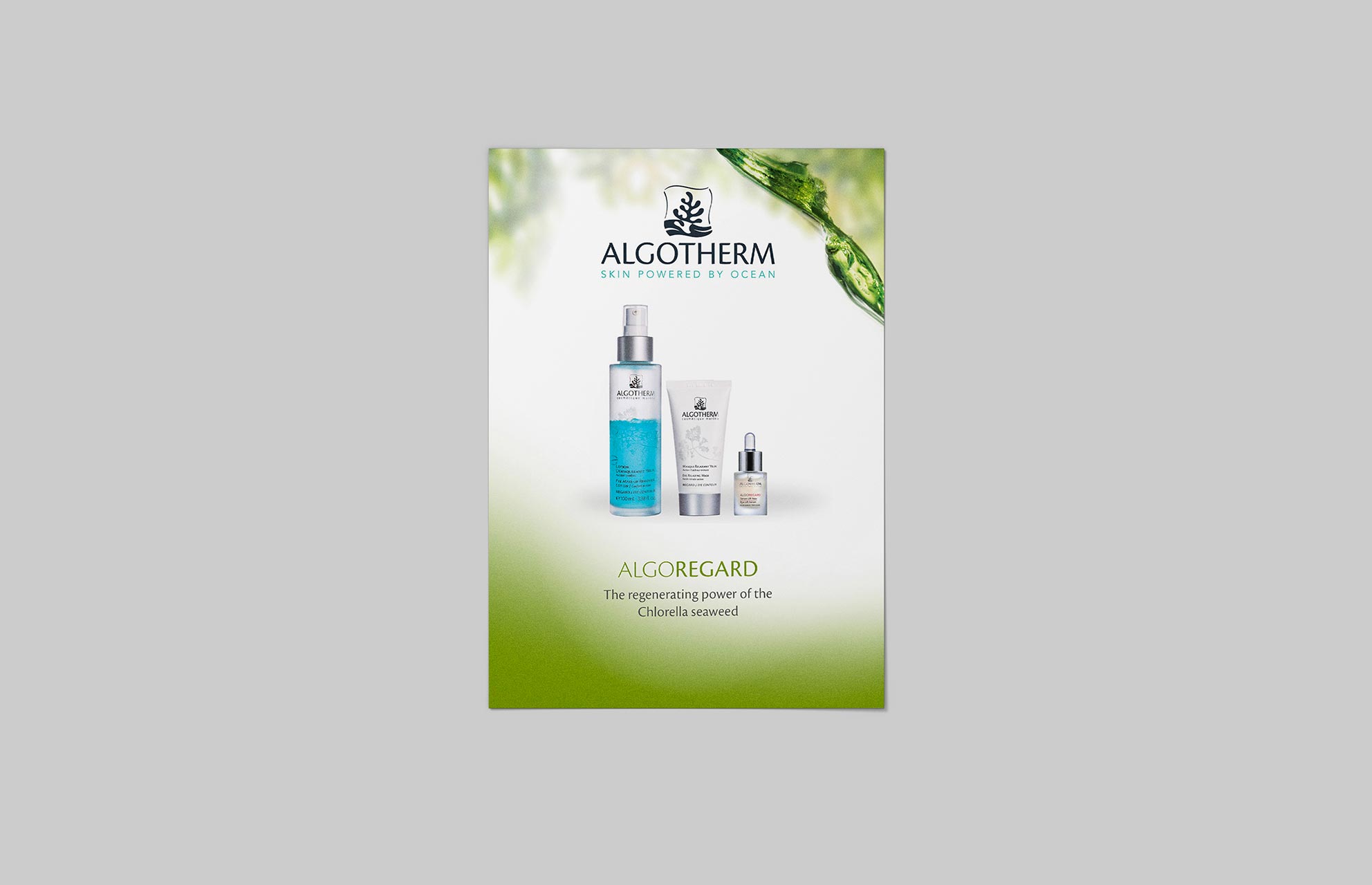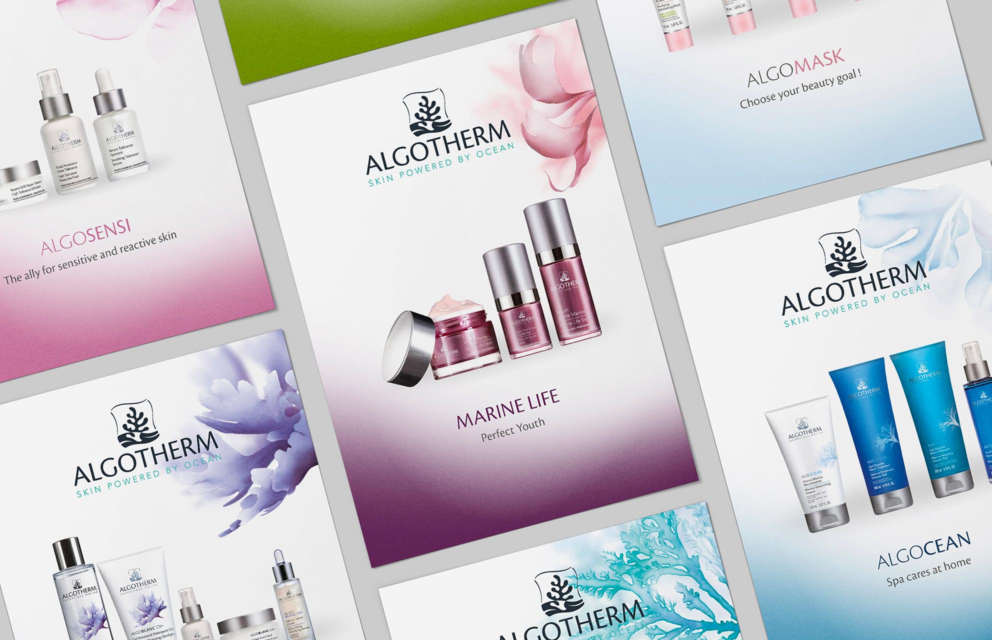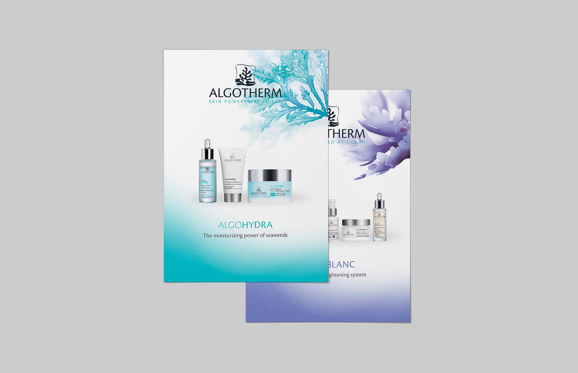 Conception de visuels de présentation produit pour les différentes gammes de la marque de cosmétique marine Algotherm des Laboratoires Gilbert dont le siège est basé en Normandie. Ces visuels se veulent sobres et épurés pour laisser la place belle aux produits, tout en rappelant la thématique grâce aux photographies d’actifs marins et les couleurs associées. Prestation graphique commandée par la filiale de Hong Kong et destinée à promouvoir le savoir-faire de la marque.